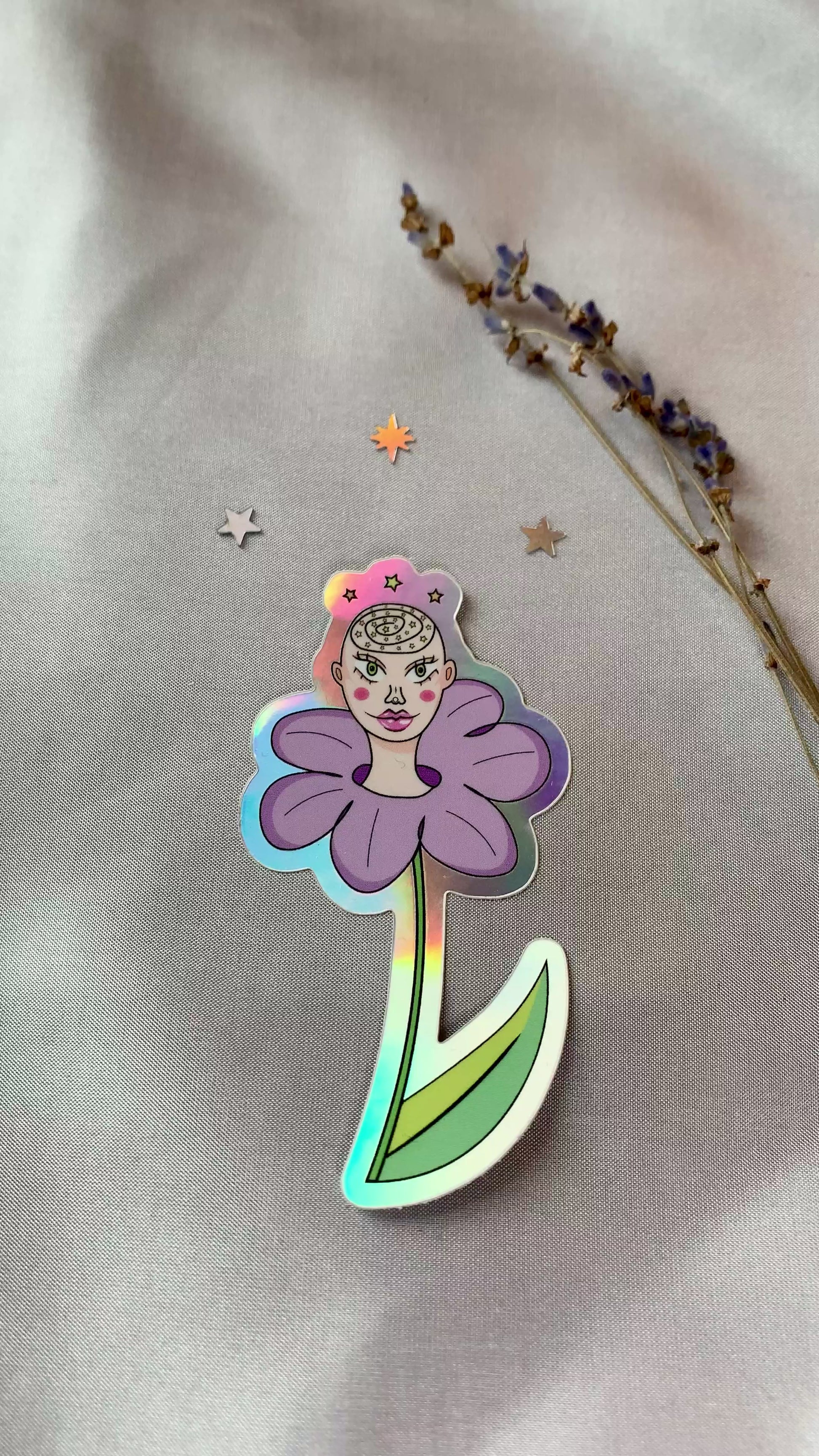 An originally designed holographic sticker of a unique flower head dizzy with the stars from the night sky!