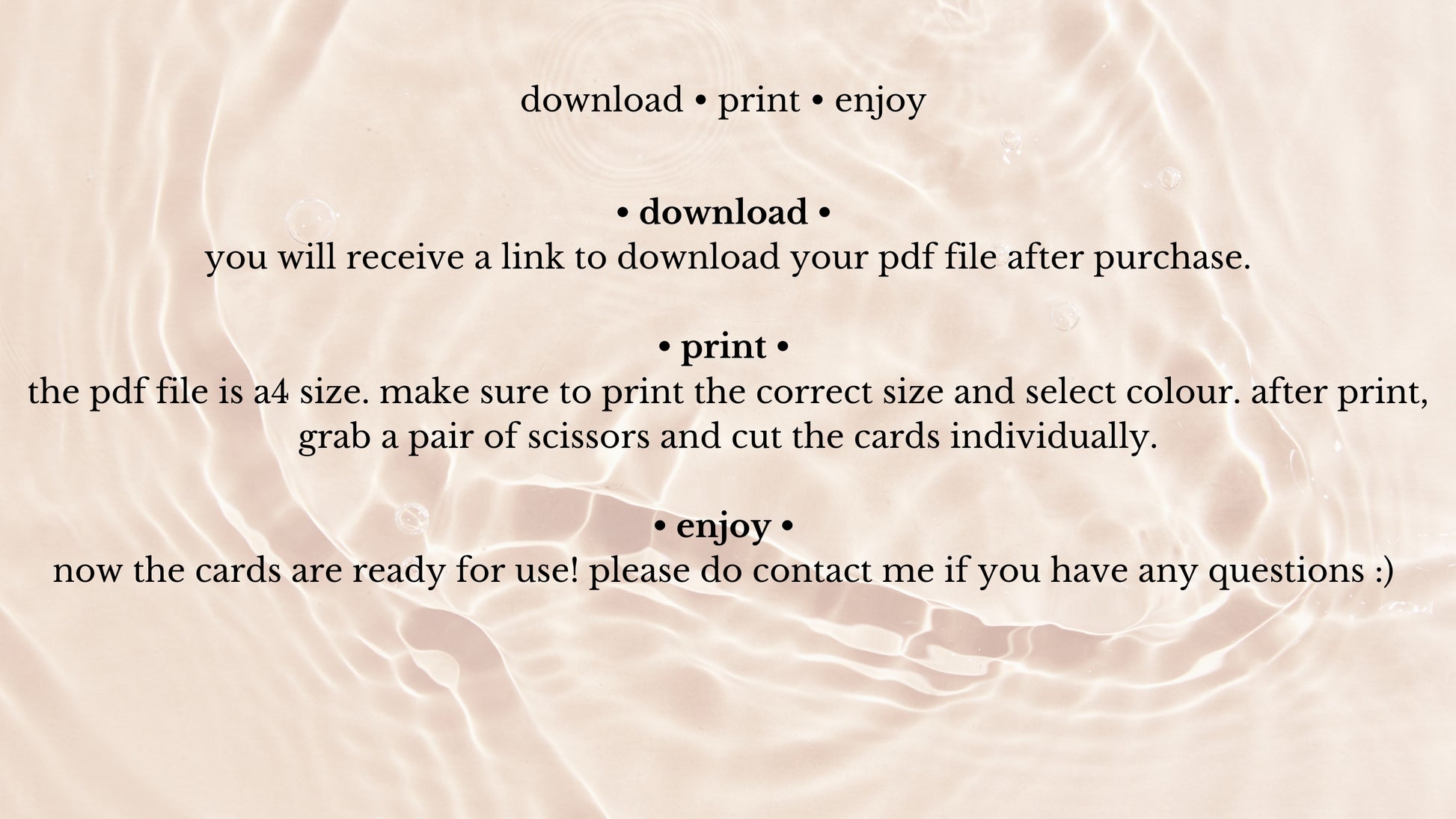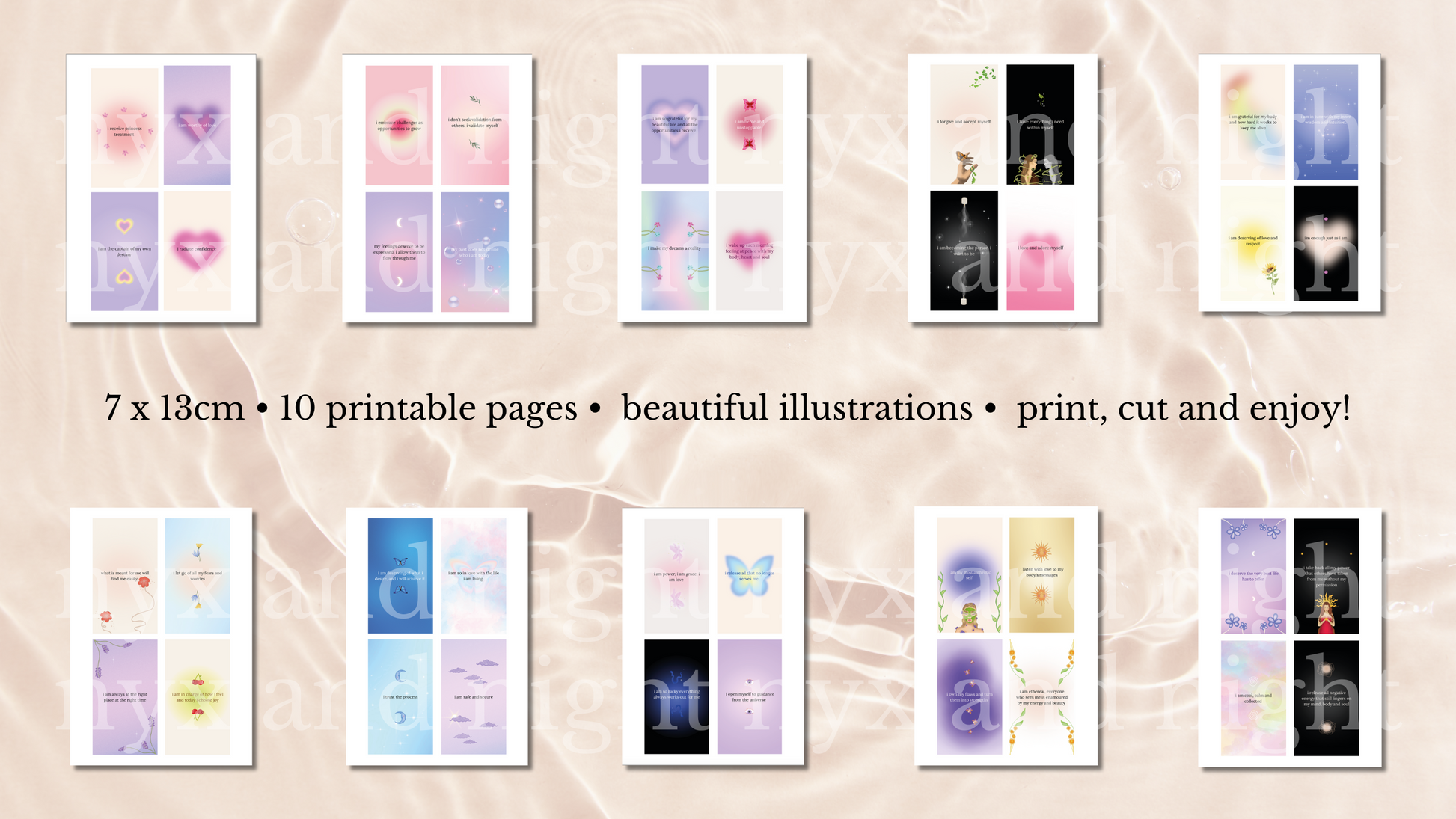 This pack comes with 10 A4-sized pages in a PDF file for seamless printing. Once printed and cut, the cards will be ready for use. Alternatively, you can use the cards for phone backgrounds or vision boards.